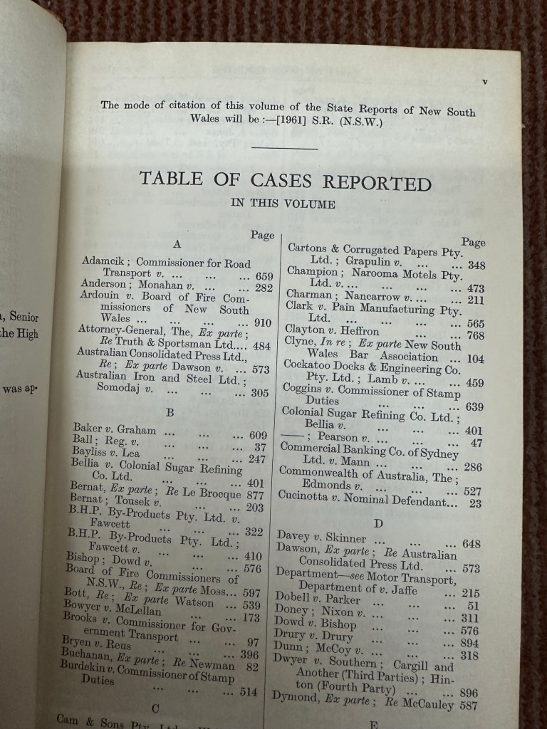 Now, I like things to have one clear and definitive answer. It’s why I enjoy probably 99 per cent of my job. But sometimes I have to acknowledge that there is no right or wrong answer. And this, I think, is one of those times. On the face of things, [1961] SR (NSW) 365 is arguably the “correct” citation. There is even a notation to that effect at the top of the Table of Cases for the 1961 volume of the report. (See the surreptitiously taken photograph below. Keen eyes will notice the High Court carpet in the background.)